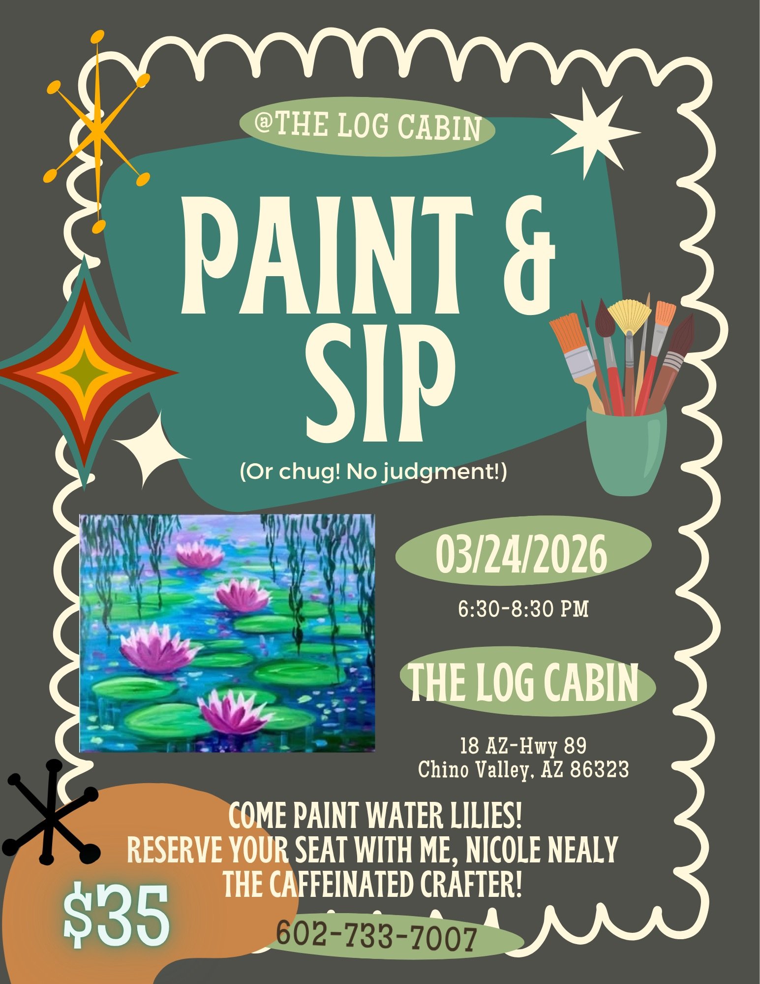 This one looks like spring and fresh and COOL temperatures! Come paint water lilies tomorrow with me at the Log Cabin. Inspired by Monet, made all the better by you!